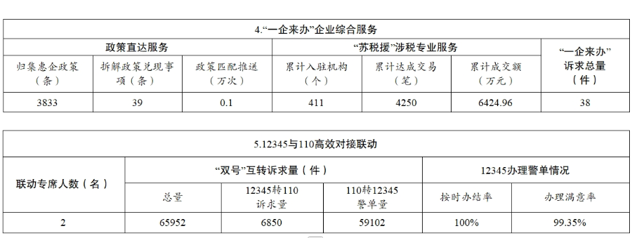 1.“一企來辦”綜合服務(wù)平臺。持續(xù)推進“一企來辦”企業(yè)綜合服務(wù)平臺建設(shè),搭建訴求服務(wù)、惠企服務(wù)等服務(wù)模塊,實現(xiàn)企業(yè)提交的政策咨詢、問題反饋、舉報投訴等問題實時收集、分流交辦,推動解決企業(yè)發(fā)展遇到的難點堵點問題。2024年3月14日正式上線“一企來辦·蘇稅援”涉稅中介服務(wù)專區(qū),已入駐涉稅機構(gòu)411戶,累計成交量4250筆,累計成交金額6424.96萬元。