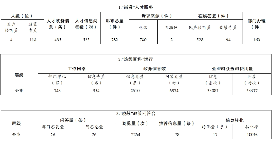 1.率先實現(xiàn)省“民聲智慧聽”平臺上線運行。承接省“民聲智慧聽”平臺試點任務(wù),構(gòu)建市縣鎮(zhèn)三級熱線服務(wù)體系,完成11個縣級分中心和108家市直承辦單位的設(shè)置,于3月21日在全省范圍內(nèi)率先上線運行。持續(xù)完善熱線服務(wù)管理機制,實現(xiàn)交辦、反饋、數(shù)據(jù)監(jiān)測等統(tǒng)一模式管理。進一步優(yōu)化平臺智能化應用,全面推進我市熱線管理統(tǒng)籌規(guī)范、服務(wù)便捷高效。